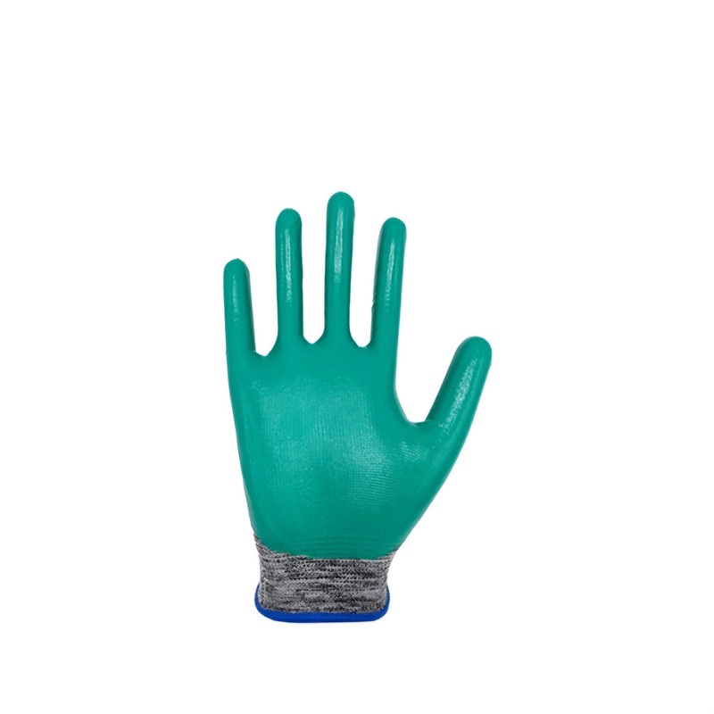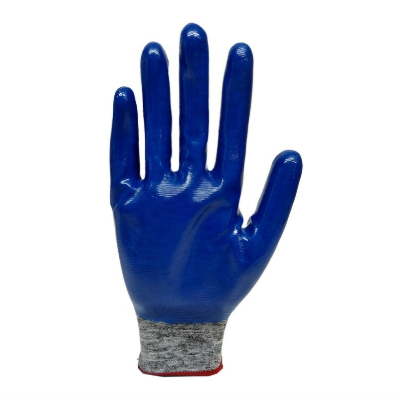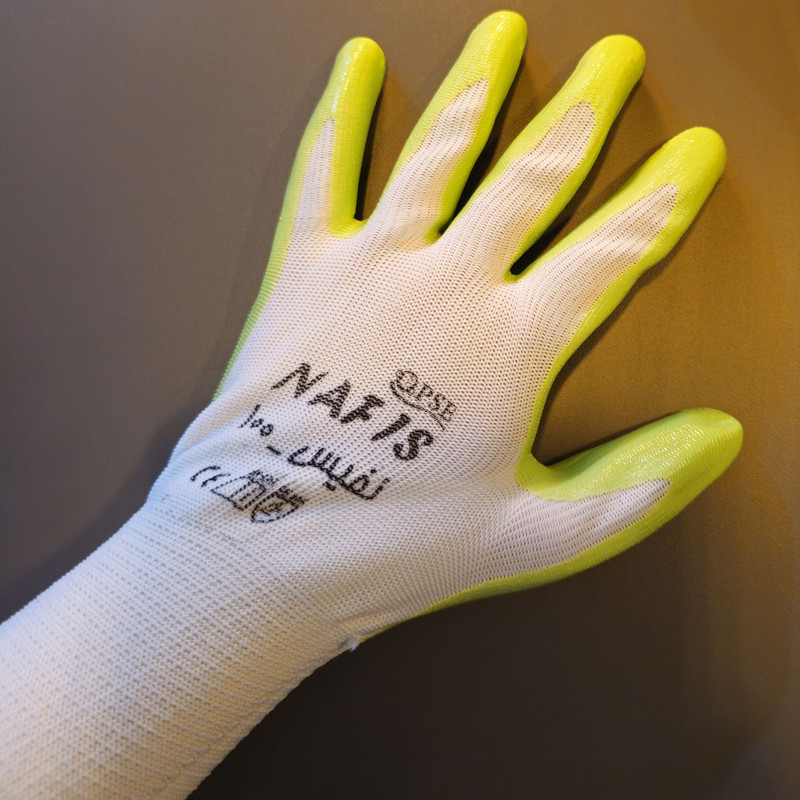 دستکش کف مواد نیتریل نفیس بافته شده از الیاف پلی استر با تراکم بافت g13 و دارای روکش کف مواد از جنس نیتریل می باشد. بافت دستکش چنگش را افزایش می دهد و مانع لیز خوردن اجسام می شود. به طور کلی دستکش های روکش شده با نیتریل برای کار با مواد نفتی و روغنی مناسب هستند.رنگ بافت آبی تیره و روکش در این مدل مشکی در نظر گرفته شده است.این دستکش در استاندارد اروپایی EN388 دارای مقاومت برشی سطح 1 و توان تحمل سایشی سطح 4، مقاومت پارگی سطح 2 و مقاومت در برابر سوراخ شدگی در سطح 1 می باشد. این محصول دستکش مناسبی برای حفاظت از دستان در فعالیت های صنعتی و کارگری سبک همچون : کارهای ساختمانی، فعالیت های مکانیکی، کار با نفت، روغن، آب صابون و امور خدماتی می باشد. رعایت استاندارد های لازم و نظارت و بررسی مستمر خط تولید، ثبات کیفی و دوام محصولات نفیس را تضمین می نماید